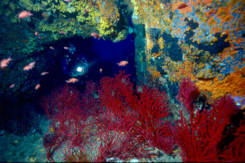 Mein Favorit liegt jedoch im südlichen Teil der Insel bei Porto Vecchio. Die Tauchbasis von Karin und Hans im Club La Chiappa (Camping und Bungalow). Die Tauchplätze die dort angefahren werden zählen nicht nur zu den schönsten Korsikas, sonder sicherlich auch zu den Top Ten des Mittelmeeres. Das Gebiet vor dem Club wurde Anfang 2000 zum Naturschutz-gebiet erklärt, was schon jetzt an einer wachsenden Population von Zackis zu erkennen ist. Die über und über mit roten und gelben Gorgonien bewachsenen Steilwände an einigen Tauchplätzen läßt einen schnell vergessen, daß die Zeit unter Wasser begrenzt ist. |
